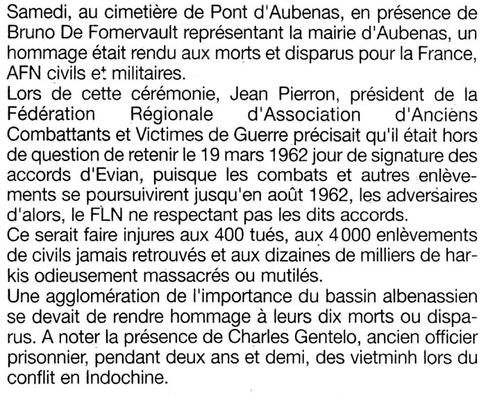 La Nation associe les rapatriés d'Afrique du Nord, les personnes disparues et les populations civiles victimes de massacres ou d'exactions commis durant la guerre d'Algérie et après le 19 mars 1962 en violation des accords d'Evian, ainsi que les victimes civiles des combats de Tunisie et du Maroc, à l'hommage rendu le 5 décembre aux combattants morts pour la France en Afrique du Nord.