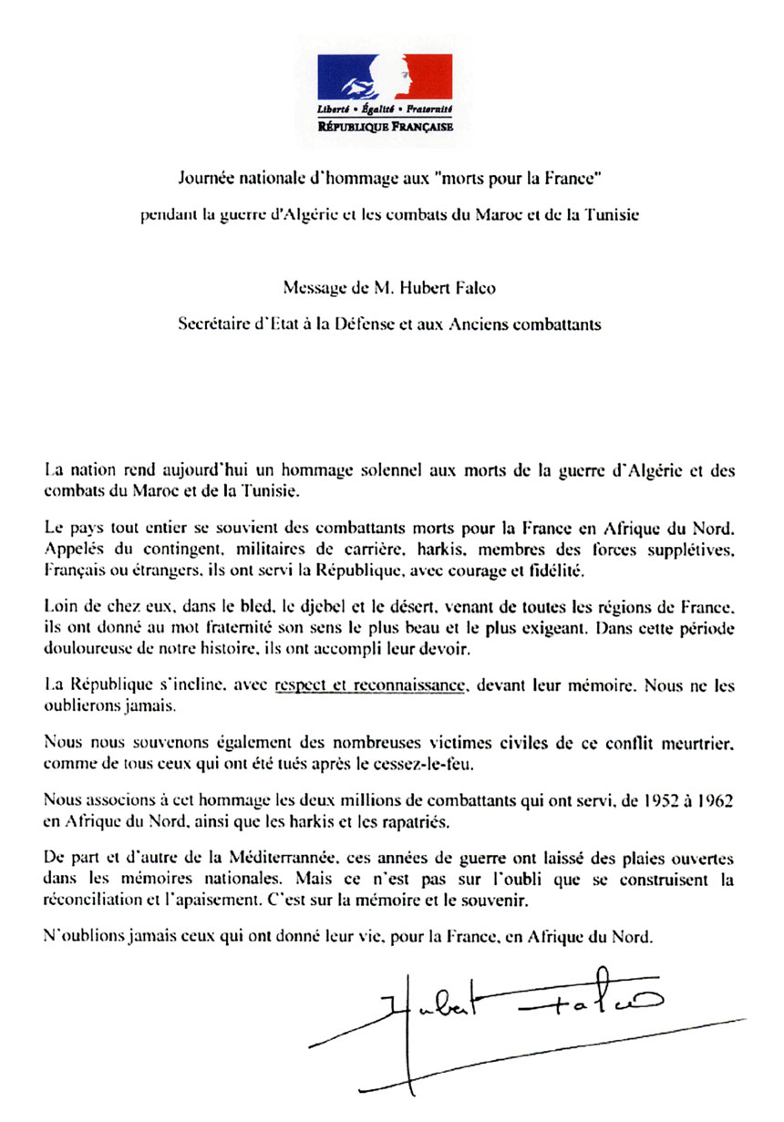 Texte du secrétaire d'état aux anciens combattants : Hubert FALCO