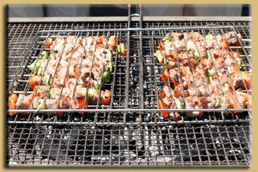 les brochettes agrémentées de morceaux de poivrons et de tomates.