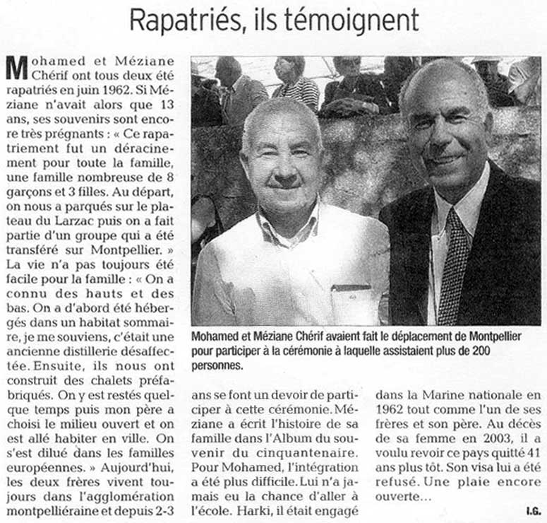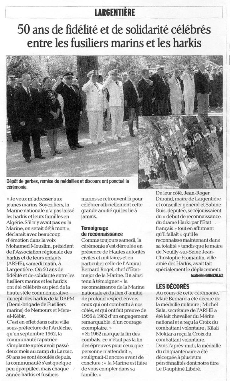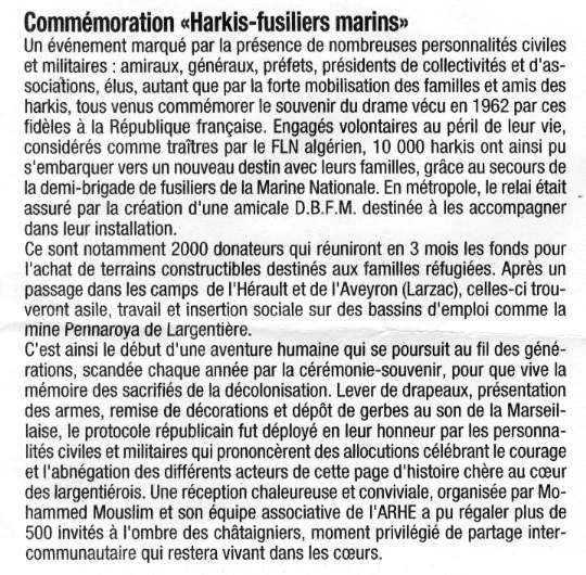 Il s'agissait de commémorer le 50ème anniversaire du rapatriement de quelques dizaines de familles Harkis à LARGENTIERE, sous-préfecture de l'Ardèche.