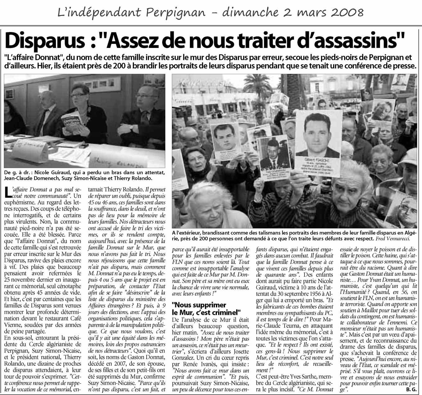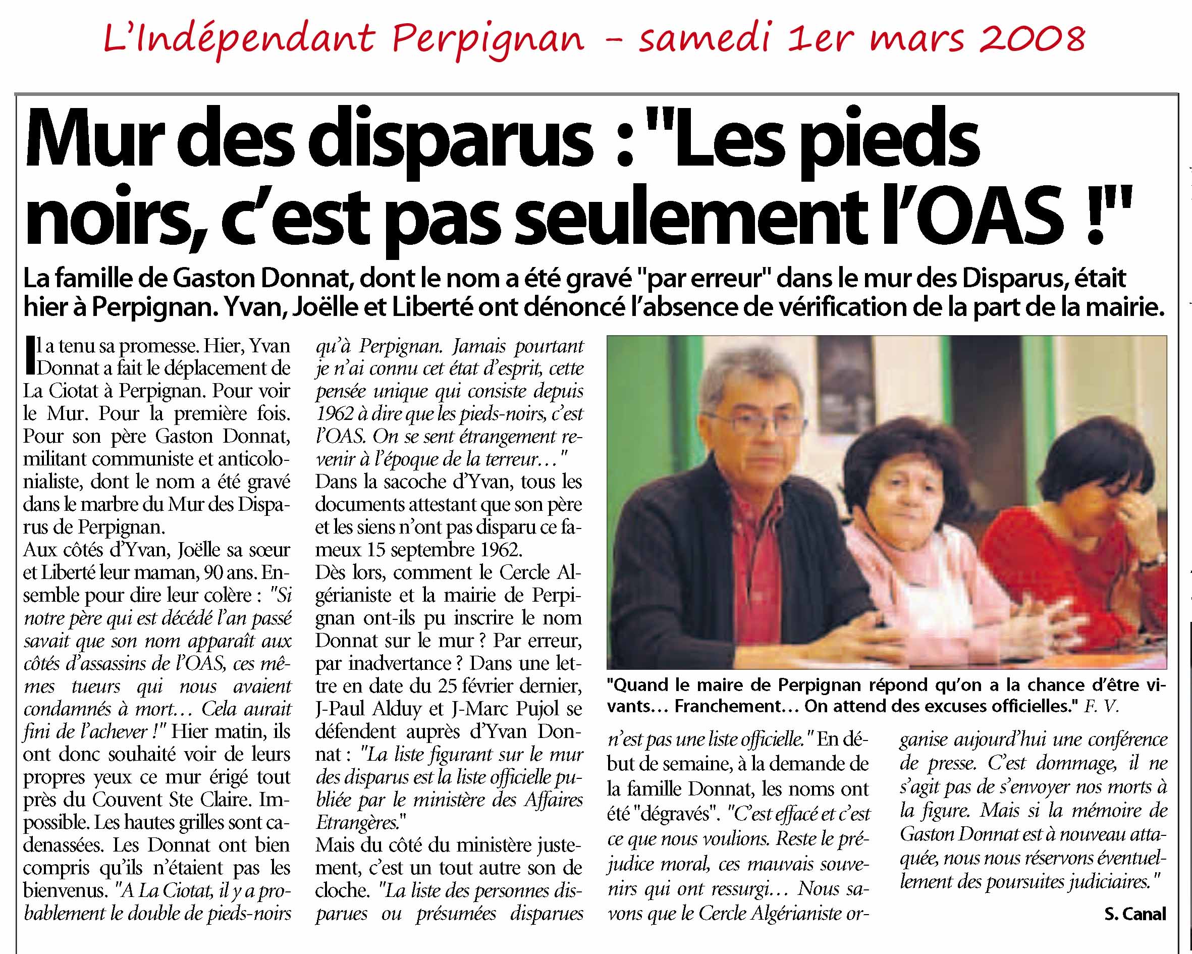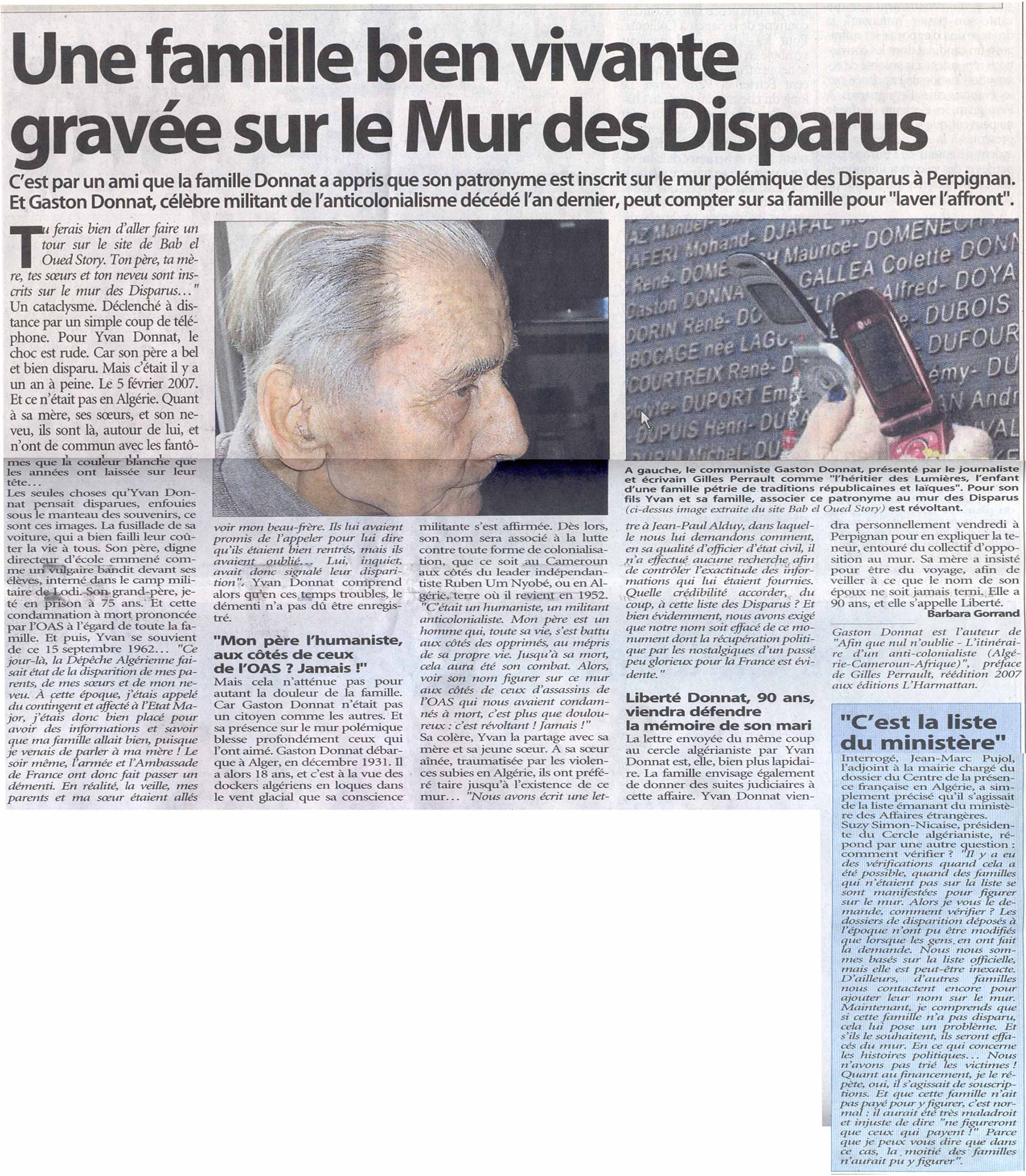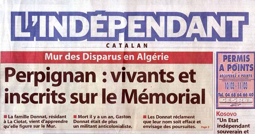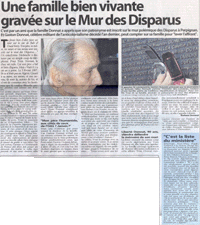 Aussi est-ce avec une immense ferveur que j'ai participé à l'inauguration du Mur des Disparus, le 25 novembre dernier à Perpignan ; nous étions trente cinq personnes du village ou de la famille venus de toute la France nous recueillir ensemble : nous qui n'avions rien, mais rien ! pour honorer la mémoire de ces si chers Disparus, nous découvrions enfin ce lieu de mémoire tant espéré. Tu ne peux savoir à quel point je suis reconnaissant envers le Cercle Algérianiste et notamment celui de Perpignan, d'avoir eu la pieuse idée de donner à toute notre communauté tant meurtrie, tant méprisée et vilipendée, ce lieu de recueillement si sobre et tellement poignant en même temps.