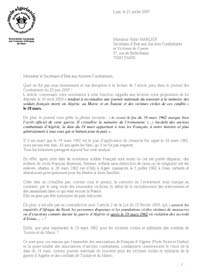 Cet article a suscité de très nombreuses réactions, auprès des associations d'Anciens Combattants. Le Président du Cercle Algérianiste de Drôme Ardèche a profité de la venue du Secrétaire d'Etat à Vassieux en Vercors, le 21 juillet 2007 (63 ème anniversaire des combats du Vercors), pour lui remettre un courrier accompagné d'une brochure expliquant la position de notre association, contre l'officialisation du 19 mars. Cette entrevue a été possible grâce à l'intervention du Député Maire de Crest, Hervé MARITON, auprès du Secrétaire d'Etat. Lors de l'entretien entre notre Président et Alain MARLEIX, ce dernier lui a affirmé qu'il respecterait la Loi et se conformerait au respect de la date du 5 décembre. Nous garderons un oeil vigilant sur ce personnage qui risque de profiter de ses nouvelles fonctions pour oeuvrer à l'officialisation du 19 mars. |