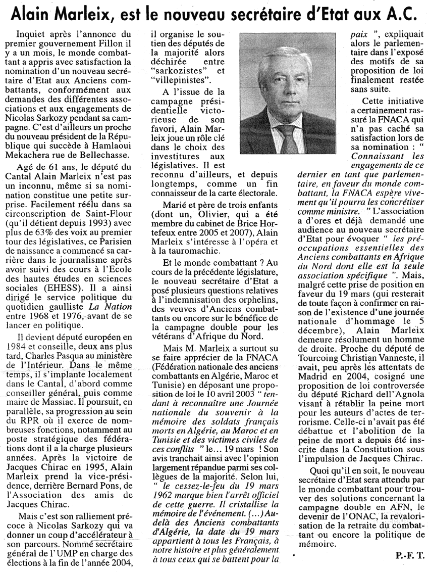 Des amis, anciens combattants, nous ont fait parvenir l'article de presse ci-dessous, paru dans «le Journal des Combattants» du 23 juin 2007. Il est question dans cet article, de la nomination d'Alain MARLEIX, au poste de Secrétaite d'Etat aux Anciens Combattants et sa prise de position, enre autre, sur l'officialisation du 19 mars, comme journée officielle de commémoration à la mémoire des soldats français morts en Algérie, au Maroc et en Tunisie et des victimes civils de ces conflits. |